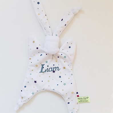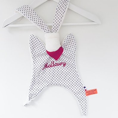 Si vous voulez offrir un cadeau unique et personnalisé on vous propose de broder l'inscription de votre choix sur les Nin-Nins, les bavoirs, les coffrets de naissance et les t-shirts. Vous retrouverez facilement les produits personnalisables grâce au macaron "coeur" en bas à droite du produit.