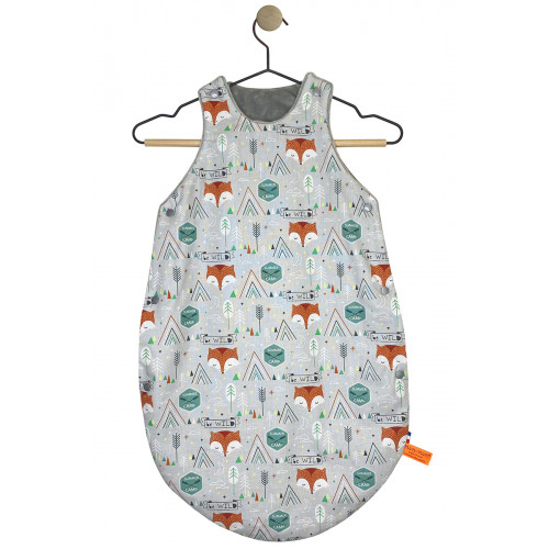 Este saco de dormir está compuesto por dos tipos de tejido: una cara de peluche que tranquiliza y tranquiliza y una cara de algodón estampado.