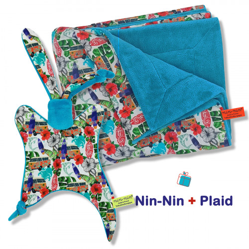 Esta caja de nacimiento contiene 1 Nin-Nin (peluche) entregado en un cubo tatuado (caja), 1 Babero Pañuelo todo entregado en 1 Bolsa de Comida acompañada de 1 Tarjeta de Felicitación.