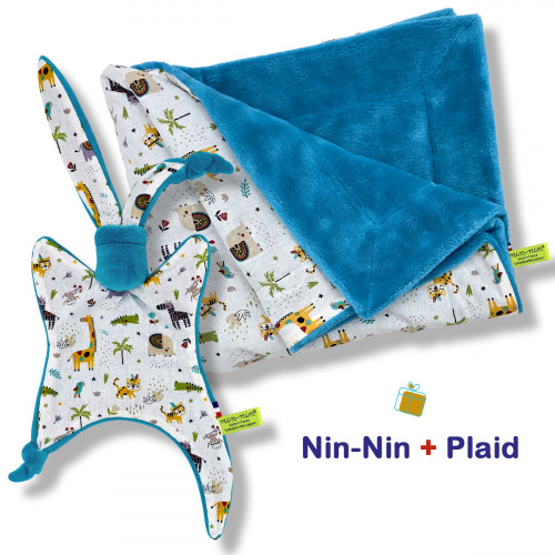 Esta caja de nacimiento contiene 1 Nin-Nin (peluche) entregado en un cubo tatuado (caja), 1 Babero Pañuelo todo entregado en 1 Bolsa de Comida acompañada de 1 Tarjeta de Felicitación.