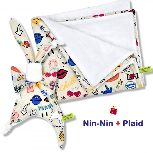 Esta caja de nacimiento contiene 1 Nin-Nin (peluche) entregado en un cubo tatuado (caja), 1 Babero Pañuelo todo entregado en 1 Bolsa de Comida acompañada de 1 Tarjeta de Felicitación.