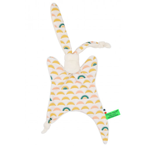 Este doudou se compone de dos tipos de tejidos: un lado ultra suave que tranquiliza y calma y un lado de algodón estampado. Sus extremos muy finos son extremadamente fáciles de agarrar y manipular para las manos muy pequeñas de recién nacidos .
