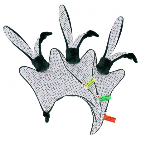 Este doudou se compone de dos tipos de tejidos: un lado ultra suave que tranquiliza y calma y un lado de algodón estampado. Sus extremos muy finos son extremadamente fáciles de agarrar y manipular para las manos muy pequeñas de recién nacidos .