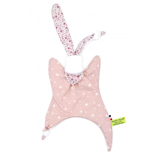 Este doudou se compone de dos tipos de tejidos: un lado ultra suave que tranquiliza y calma y un lado de algodón estampado. Sus extremos muy finos son extremadamente fáciles de agarrar y manipular para las manos muy pequeñas de recién nacidos .