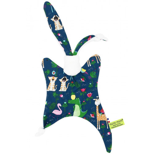 Este doudou se compone de dos tipos de tejidos: un lado ultra suave que tranquiliza y calma y un lado de algodón estampado. Sus extremos muy finos son extremadamente fáciles de agarrar y manipular para las manos muy pequeñas de recién nacidos .