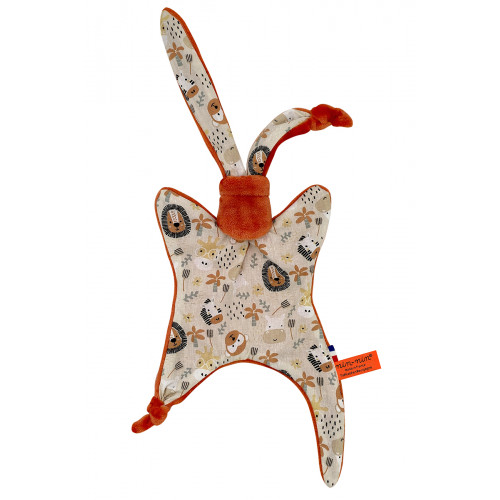 Ce doudou est composé de deux types de tissus : un côté ultra doux qui rassure et apaise et un coté coton imprimé. Ses extrémités très fines sont extrêmement faciles à prendre en main et à manipuler pour les toutes petites mains des nouveau-nés.