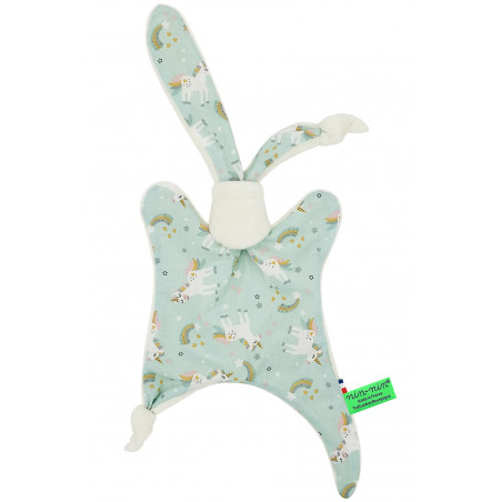 Ce doudou est composé de deux types de tissus : un côté ultra doux qui rassure et apaise et un coté coton imprimé. Ses extrémités très fines sont extrêmement faciles à prendre en main et à manipuler pour les toutes petites mains des nouveau-nés.